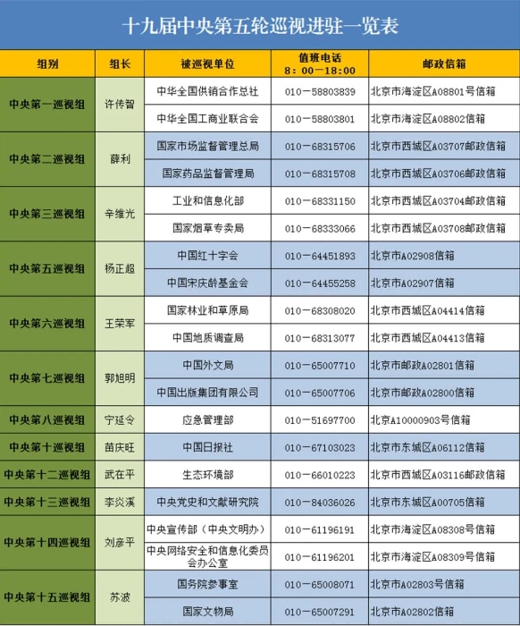 经党中央批准,十九届中央第五轮巡视对中央宣传部(中央文明办)、中央政法委机关、中央网信办、工业和信息化部、自然资源部、生态环境部、应急管理部、国家市场监督管理总局、国家广播电视总局、国务院参事室、中央党史和文献研究院、中央档案馆、中国外文出版发行事业局、人民日报社、求是杂志社、光明日报社、中国日报社、经济日报社、国务院发展研究中心、中央广播电视总台、中国气象局、国家信访局、国家烟草专卖局、国家林业和草原局、国家文物局、中国地震局、国家煤矿安全监察局、国家药品监督管理局、国家知识产权局、中国地质调查局、中华全国供销合作总社、中国宋庆龄基金会、中国红十字会、中华全国工商业联合会、中国出版集团公司等35个中央和国家机关单位党组织开展常规巡视。