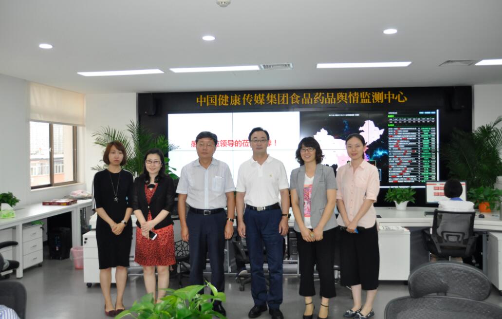 8月16日下午,内蒙古自治区食药监局副局长格日勒图(右图右三)与内蒙古自治区通辽市食药监局局长李惠放(右图左三)到中国健康传媒集团调研并参观传媒集团舆情监测中心,希望与传媒集团在新闻宣传、舆情应对、在线培训等领域加强交流合作,充分发挥集团专业优势,传播健康知识、传递监管正能量。
